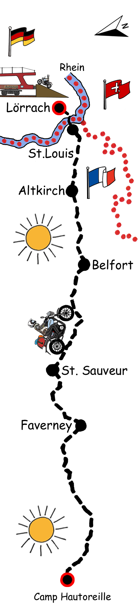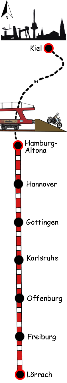 Ein letztes Mal auf dieser Reise breche ich das Lager ab und verstaue unser Gepäck sorgfältig auf dem Rücken der Honda. Nach einer letzten Tasse Kaffee mit den Wienern verabschiede ich mich und breche auf. Wir haben ein Ticket für den Autozug von Lörrach nach Hamburg.