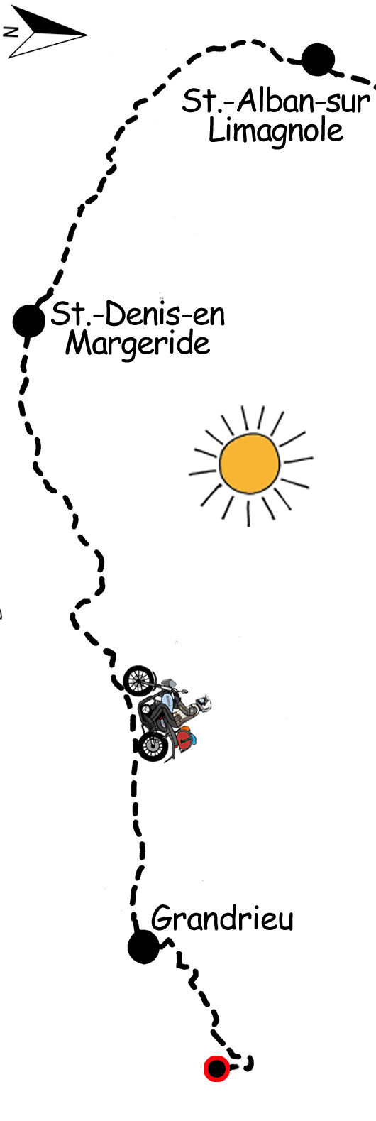 In Saint-Alban-sur-Limagnole stelle ich das Motorrad ab und sehe mich um. Der Ort liegt am französischen Jakobsweg Via Podiensis und es gibt mehrere Pilgerherbergen, französisch: Gîte d'étape.